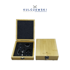 – 1 Set de Accesorios para Vinos grabado a elección con 2 líneas de texto o 1 Logo.