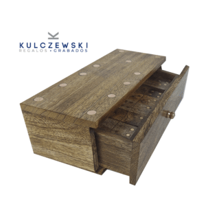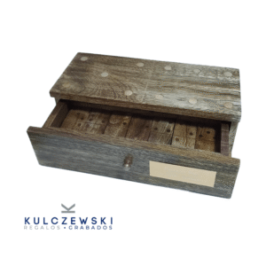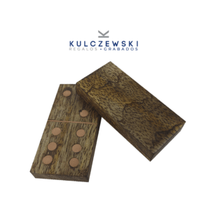 Un clásico con carácter: este juego de dominó de madera que invita a jugar con todos los sentidos. Sus detalles en cobre aportan calidez y distinción, haciendo de cada partida una experiencia elegante y memorable. Perfecto como objeto de diseño o regalo significativo, que con una placa grabada seguro dejará huella en quien lo reciba.