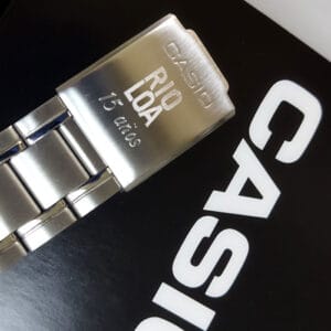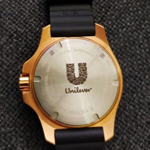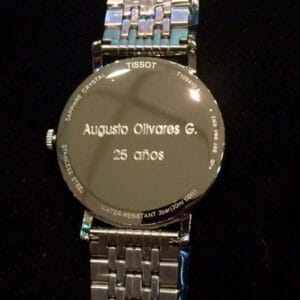 Grabamos la contratapa de los relojes, siendo muy importante fijarse en la cantidad de espacio disponible para grabar. Algunas veces la superficie es de cromo y en otras de acero. En las cromadas grabamos con diamante (en brillo) y en acero puede grabarse con diamante o con láser.